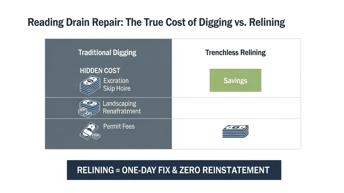 If you wait until the pipe collapses, the cost jumps from a standard £600–£1,200 relining job to a full-scale excavation that can easily exceed £3,000-£5,000, especially if we have to navigate utility lines or reinstate expensive landscaping near Epsom.